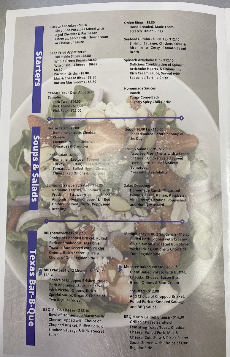 Choice of Sliced or Chopped Brisket, Pulled Pork or Smoked Sausage Served on a Bun with Pickles, Onions and Rick's Secret Sauce